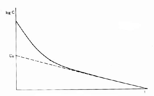从另一方面看,时量曲线在达到假平衡后已呈单一指数衰减的直线,此时房室划分已无需要,可以按β值计算t1/2及其他实用的药动学指标。