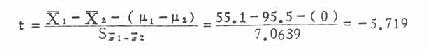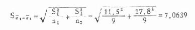 (3)求统计量 已知X1=55.1,X2=95.5,至于求t值时作为分母的标准误,在暂缺原始数据时由已知的两个标准差先推算出合并方差Sc2进而求出Sχ1-χ2即可,方法如下;