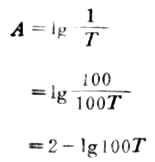 标尺上透光率T是等分的而吸光度A的刻度是不均匀的。透光率T可用小数或百分率表示。A与T的关系可推导为:
