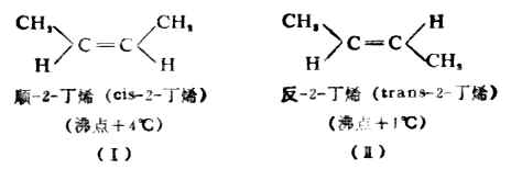 除上述两种异构现象外,由于以双键相连的两个碳原子不能绕σ键轴自由旋转,所以当两个碳原子上各连有两个不同的原子或基团时(如2-丁烯),双键上的四个基团在空间就可以有两种不同的排列方式,即两种构型。