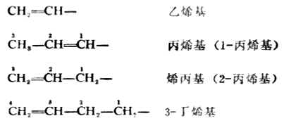 烯烃去掉一个氢原子生成一价基团,叫做烯基。碳链的编号应从含有自由键的碳原子开始。例如: