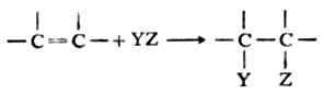 烯烃的加成反应是指在起反应时,烯烃分子中π键断裂,试剂中的两个原子或原子团分别加到双键的两个碳原子上的反应。双键加成的典型反应可表示为: