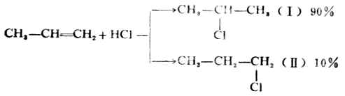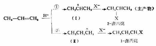 不对称烯烃(如丙烯)与HX的加成符合马氏规则。反应第一步生成的碳正离子有两种可能性:一种是(Ⅰ),即正电荷在中间一个碳原子(C-2)上;另一种是(Ⅱ),即正电荷在末端的碳原子(C-1)上。