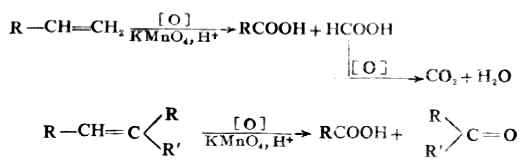 烯烃与酸性高锰酸钾溶液作用,碳链在双键处断裂,生成碳原子数较少的羧酸和酮等。例如: