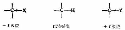 箭头指的方向是电子偏移的方向。与氢相比,X具有吸电子性,我们把它们叫做吸电子基。由它们所引起的诱导效应叫做吸电子诱导效应或亲电诱导效应,一般用-I表示。如果Y的电负性小于氢原子,则当Y取代后,C-Y键的电子向碳偏移。与氢相比,Y具有斥电子性,我们把它们叫做斥电子基。由它们所引起的诱导效应叫做斥电子诱导效应,或叫供电诱导效应,用+I表示。