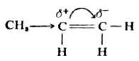 马氏规则还可以用甲基的诱导效应来解释。丙烯是不对称烯烃,与乙烯不同。乙烯的双键的两个碳原子各连两个氢,其分子中π电子云的分布是均匀的。丙烯双键的两个碳原子中,有一个连两个氢,另一个连着氢和甲基。由于氢与甲基的电负性不同,氢的电负性大,甲基的电负性小,所以,丙烯分子中碳碳双键上的电子云密度比乙烯的大,同时π电子云的分布也不均匀: