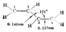 在1,3-丁二烯分子中,两个C=C的键长为0.137nm,比一般的烯烃分子中的C=C的键长(0.133nm)长,而C(2)-C(3)键长为0.146nm,它比一般的烷烃分子中的C-C的键长(0.154nm)短,这种现象叫做键长的平均化。
