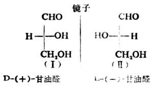 物质分子中各原子或原子团在空间的实际排布叫做这种分子的绝对构型。现在已能用X射线衍射等方法测定了许多化合物分子的绝对构型,但在1951年以前还没有解决这个问题。1906年,罗沙诺夫建议把(+)-及(-)-甘油醛作为其他旋光性异构体物质的构型的比较标准,并人为地规定,在费歇尔投影式中,手性碳上的OH排在横线右边的为右旋甘油醛(Ⅰ),作为D型,手性碳上的OH排在横线左边的为左旋甘油醛(Ⅱ),作为L型。D-及L-分别表示它们的构型。应注意,D及L仅表示其构型,与其旋光性(+)、(-)无关。当一个旋光性物质发生化学反应时,只要手性碳上的任何一个键都未断裂,则这个手性碳的构型就没有改变。这样,许多其他物质分子的构型都可以通过直接或间接的化学转变,与D型或L型甘油醛相联系,其条件是相当于甘油分子的手性碳上的每一个键,在转变过程中都不发生断裂。如果该物质与D型甘油醛相联系时,其分子的构型即为D型,如与L型甘油醛相关联时,它的分子构型则属于L型。用这种方法确定的构型是相对于标准物质——甘油醛而来的,所以叫做相对构型。