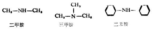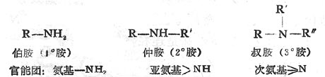 胺可以看作是氨(NH3)分子中的氢原子被烃基取代所生成的化合物。通式为RNH2,R2NH或R3N,其中R代表脂肪烃基或芳香烃基,它们分别属于伯、仲和叔胺。