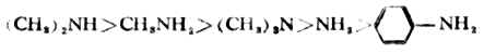 在水溶液中,脂肪胺一般以仲胺的碱性最强。但是,无论伯、仲或叔胺,其碱性都比氨强。芳香胺的碱性则比氨弱。氨、甲胺、二甲胺、三甲胺和苯胺的碱性强弱次序为: