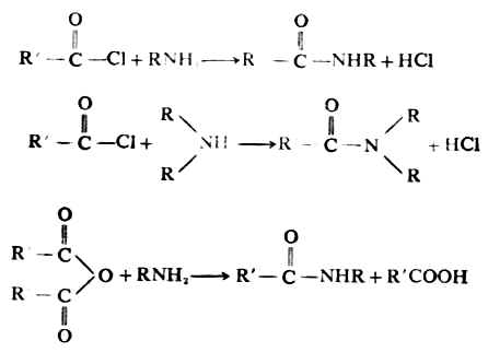 伯、仲胺都能与酰化剂(如乙酰氯、乙酸酐)作用,氨基上的氧原子被酰基取代,生成酰胺,这种反应叫做胺的酰化。叔胺因氮上没有氢,故不发生酰化反应。