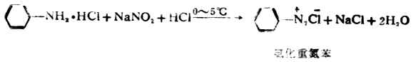 芳香族伯胺与脂肪伯胺不同,在低温和强酸存在下,与亚硝酸作用则生成芳香族重氮盐,这个反应称为重氮化反应。例如: