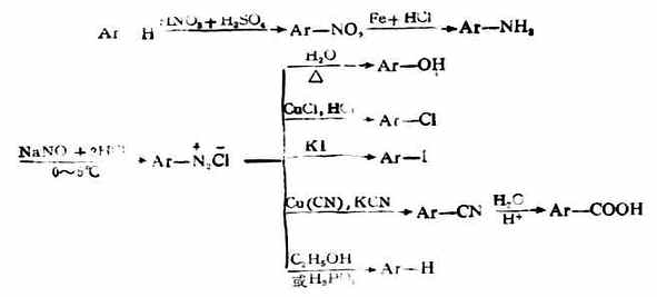 基、氢原子等取代,生成相应的芳香族衍生物,放出氮气。因此,利用这些反应可以从芳香烃开始合成一系列芳香族化合物。