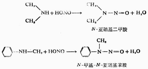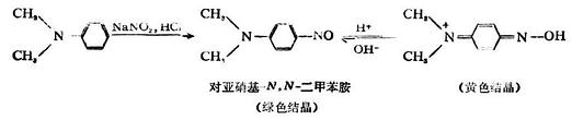 芳香族叔胺与亚硝酸作用,发生环上取代反应,在芳香环上引入亚硝基,生成对亚硝基取代物,在酸性溶液中呈黄色,若对位上已有取代基,则亚硝基取代在邻位。