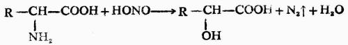 氨基酸中的氨基具有伯胺的性质,与亚硝酸作用时生成羟基酸,同时定量的放出氮气。