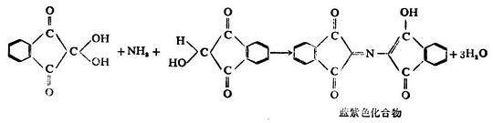 α-氨基酸与茚三酮的水合物在水溶液中加热时,生成蓝紫色或紫色化合物,同时产生醛、二氧化碳和氨。这个反应非常灵敏,是鉴定氨基酸最迅速、最简单的方法,常用于α-氨基酸的比色测定或纸层析、薄层层析时的显色。