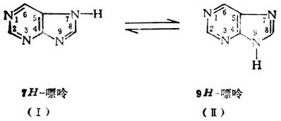 结晶态嘌呤为(Ⅰ)式,在水溶液中(Ⅰ)式与(Ⅱ)式则以等比例共存。药物分子中一般多为7H-嘌呤(Ⅰ式)衍生物,生物体中则9H-嘌呤(Ⅱ式)更为常见。