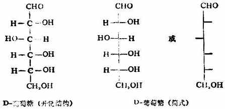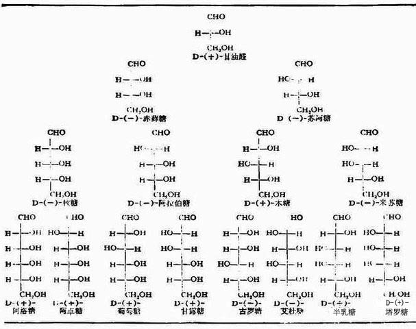 单糖构型的确定仍沿用D/L法。这种方法只考虑与羰基相距最远的一个手性碳的构型,此手性碳上的羟基在右边的D型,在左边的L型。自然界存在的单糖多属D型糖。例如: