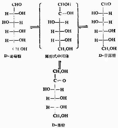 D-果糖、D-甘露糖和D-葡萄糖的C-3、C-4,C-5和C-6的结构完全相同,只有C-1和C-2的结构不同,但是它们的C-1,C-2的结构互变成烯醇型时,其结构完全相同的。因此,不单是D-葡萄糖,而D-果糖或D-甘露糖在稀碱催化下,都能互变为三者的混合物。