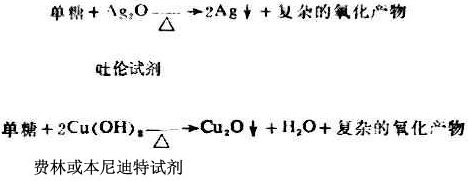 单糖无论是醛糖或酮糖都可与弱的氧化剂叶伦试剂、费林试剂和本尼迪特试剂作用,生成金属或金属的低价氧化物。上述三种试剂都是碱性的弱氧化剂。单糖在碱性溶液中加热,生成复杂的混合物。
