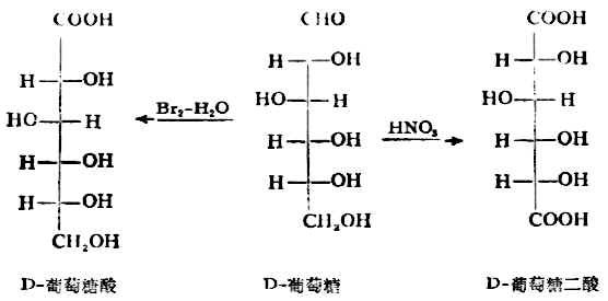 单糖在酸性条件下氧化时,由于氧化剂的强弱不同,单糖的氧化产物也不同。例如,葡萄糖被溴水氧化时,生成葡萄糖酸;而用强氧化剂硝酸氧化时,则生成葡萄糖二酸。