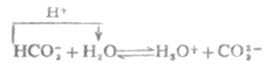 HCO-3作为酸,根据数学推导,当Ka2C>20KW,且c>20Ka1时,水的离解可以忽略,且两性物质浓度不是很稀时,HCO-3溶液中[H+]的近似计算式为