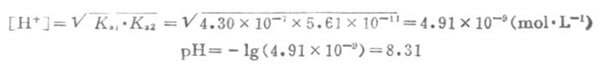 例4 计算0.10mol.L-1 NaHCO3溶液的pH值。已知H2CO3的Ka1=4.30*10-7,Ka1=5.61*10-11。