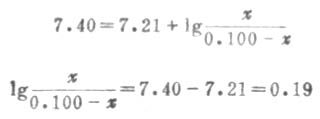 例7 H2PO2-4已知的pKa=7.21,求浓度为0.100mol.L-1、pH7.40的磷酸盐缓冲溶液的缓冲比以及共轭碱HPO2-4和共轭酸H2PO2-4的浓度。