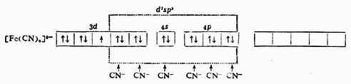 例2 [Fe(CN)6]3- Fe原子和Fe 3+的价电子层结构分别是3d6,4s2,3d5。