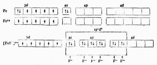 当Fe 3+和6个F-形成[FeF6]3-配离子时,磁矩未变,说明配离子中仍保留有5个未成对电子。配位键理论认为:Fe 3+利用外层的一个4 s 轨道、3个4p轨道和2个4d轨道与6个配位体F-成键,故所形成的[FeF6]3-配离子属外轨型,它的外层电子结构为: