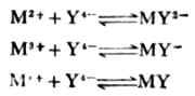 除碱金属离子外,EDTA几乎能与所有的金属离子形成稳定的金属螯合物。并且,在一般情况下,不论金属离子是几价,1个金属离子都能与1个EDTA酸根(Y4-)形成可溶性的稳定螯合物。例如: