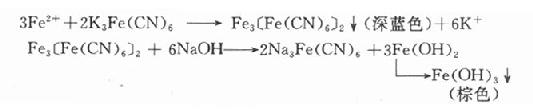 (1)取供试品溶液,加铁氰化钾试液,即发生深蓝色沉淀。分离,沉淀在稀盐中不溶,但氢氧化钠试液,即分解成色棕色沉淀。