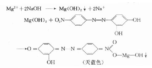 该反应系一种有机染料吸附Mg(OH)2↓而产生的沉。如下溶液过酸,呈黄色,可再滴加适量的氢氧化钠试液。