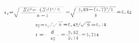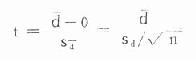 式中,0为差数年总体均数,因为假设处理前后或两法无差别,则其差数的均数应为0,d为一组成对数据之差d(简称差数)的均数,其计算公式同式(18.1);Sd为差数均数的标准误,sd为差数年的标准差,计算公式同式(18.3);n为对子数。