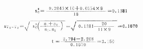 式中sx1-x2,为两样本均数之差的标准误,s2c为合并估计方差(combined estimate variance)。算得的统计量为t,按表19-4所示关系作出判断。