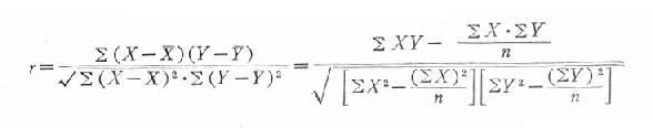 相关系数是表示两个变量(X,Y)之间线性关系密切程度的指标,用r表示,其值在-1至+1间。如两者呈正相关,r呈正值,r=1时为完全正相关;如两者呈负相关则r呈负值,而r=-1时为完全负相关。完全正相关或负相关时,所有图点都在直线回归线上;点子的分布在直线回归线上下越离散,r的绝对值越小。当例数相等时,相关系数的绝对值越接近1,相关越密切;越接近于0,相关越不密切。当r=0时,说明X和Y两个变量之间无直线关系。计算相关系数的公式为: