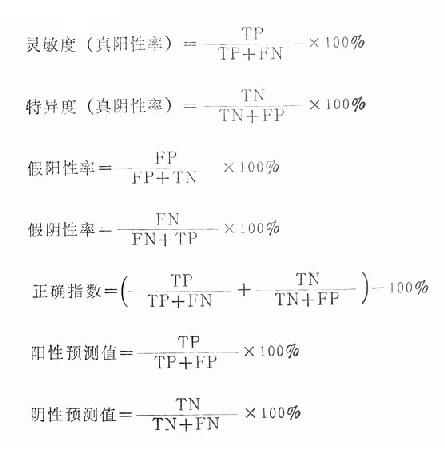 1.须同标准诊断方法(金标准,gold standard)进行盲法比较。标准诊断方法是指可靠的,公认的诊断方法,它能正确地区分有病和无病。临床上常用的标准诊断方法包括病理学检查,外科手术所见以及长期随访病例所获得的肯定结论。例如,诊断冠心病的标准诊断方法是冠状动脉造影,诊断肾炎的标准方法是肾组织活检和尸体解剖,诊断胆结石的标准方法是手术所见。具体作法是运用标准诊断方法,在“盲”的条件下将病例区分为实际有病和无病两组,再将待评价的诊断试验与相同病例诊断的结果作比较,然后列出四格表,就可得出真假阳性和真假阴性的结果,如表33-1所示,并计算灵敏度、特异度、预测值和正确指数等。