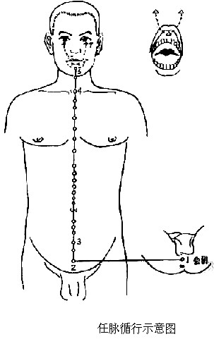 1.经脉循行:起于小腹内,下出会阴部,向上行于阴毛部,沿腹内向上经前正中线到达咽喉部,再向上环绕口唇,经面部入目眶下。