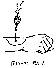是针刺与艾灸结合使用的一种方法,适应于既需要留针又必须施灸的疾病,方法是,先针刺得气后,将毫针留在适当深度,再将艾绒捏在针柄上点燃直到艾绒燃完为止。或在针柄上穿置一段长约1-2厘米的艾条施灸,使热力通过针身传入体内,达到治疗目的(图10-79)。
