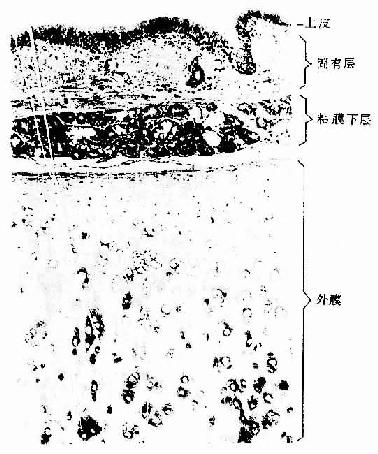 2.粘膜下层 为疏松结缔组织,与固有层和外膜无明显分界。粘膜下层除有血管、淋巴管和神经外,还有较多混合性腺。