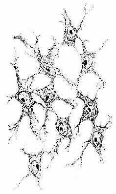 结缔组织均起源于胚胎时期的间充质(mesenchyme)。间充质由间充质细胞和大量稀薄的无定形基质构成。间充质细胞呈星状,细胞间以突起相互连接成网,核大,核仁明显,胞质弱嗜碱性(图3-1)。间充质细胞分化程度低,在胚胎时期能分化成各种结缔细胞、内皮细胞、平滑肌细胞等。成体结缔组织内仍保留少量未分化的间质细胞。