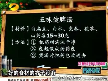 常海沧治脾虚:五味健脾汤 材料:白扁豆、白术、胆参、茯苓、山药各15~30克。 做法: 1,把药材淘洗干净。 2,包起做成汤药包。 3,熬粥或煲汤时放入锅中一起煮,煮好后取出汤料包,喝粥或汤即可。 中医脾虚症是指中医所称之脾脏虚弱而引起的病症,其病情虽较繁杂,主要有呕吐、泄泻、水肿、出血、经闭、带下、四肢逆冷、小儿多涎等。脾在五行中属土,在五脏阴阳中属阴中之至阴。脾主运化,统血,升清,输布水谷精微,为“气血生化之源”。人体出生后,各脏腑组织器官皆依赖脾所化生的水谷精微以濡养,故称脾为“后天之本”。其与胃、肉、唇、口等构成脾系统。
