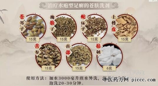 蛇床子温热燥湿;苦参清热燥湿、杀虫止痒;枯矾治疗脚湿气;苍肤洗剂有祛风、除湿、杀虫,止痒的功效。