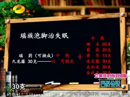 瑶医覃迅云上湖南卫视百科全说节目介绍 失眠泡脚药方 瑶药配方:九龙藤30克(可换成川芎30克)+磁石60克+菊花20克+黄芩15克+夜交藤30克+五加皮30克+合欢皮30克 专家建议:温水泡脚有助于促进睡眠,严重的失眠需要及时就医治疗。