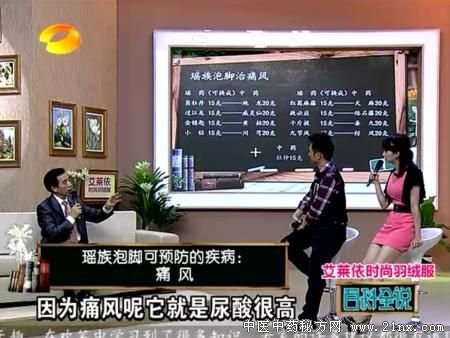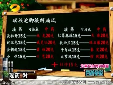 瑶医覃迅云上湖南卫视百科全说节目介绍 缓解痛风泡脚药方 瑶药配方 :臭牡丹、过江龙、金钥匙、小钻、红葛麻藤、救必应、千斤拨、九节风各15克 (可换成地龙、威灵仙、黄柏、川芎、天麻、络石藤、秦究、防风各20克加杜仲15克)