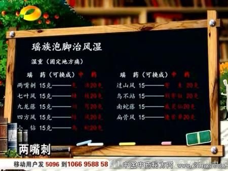 瑶族泡脚治湿重型风湿(固定地方痛)药方 配方 瑶药:两嘴刺、七叶风、九龙藤、四方风、小钻、过山风、鸟不站、南蛇藤、扁骨风各15克(可换成羌活、桂枝、川芎、防风、乌蛇、寄生、刘寄奴、威灵仙、透骨草各20克) 百科全说视频覃迅云 |