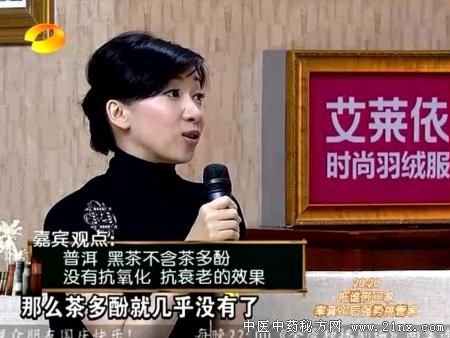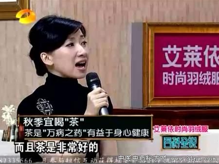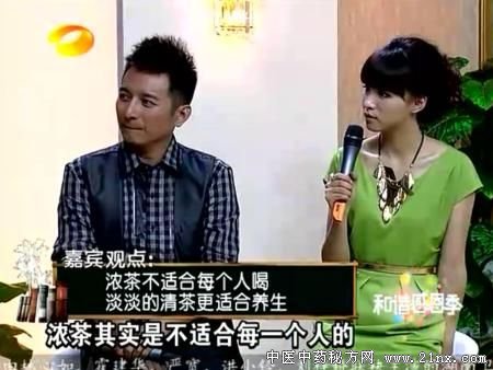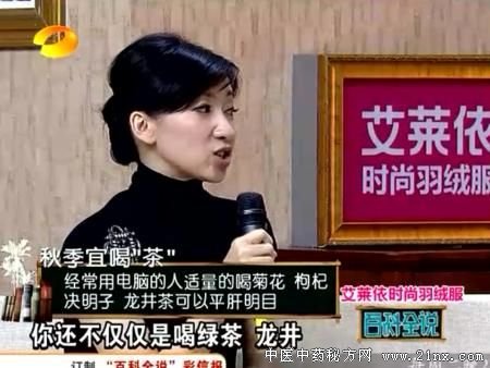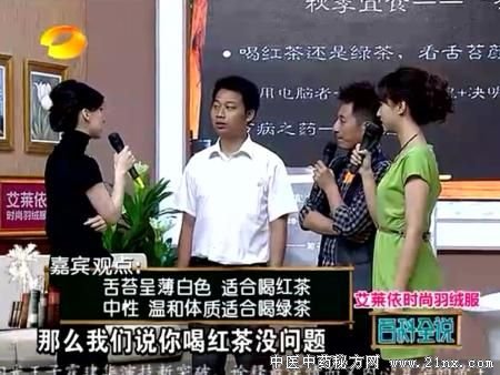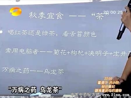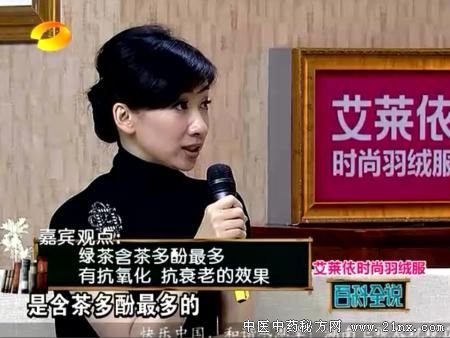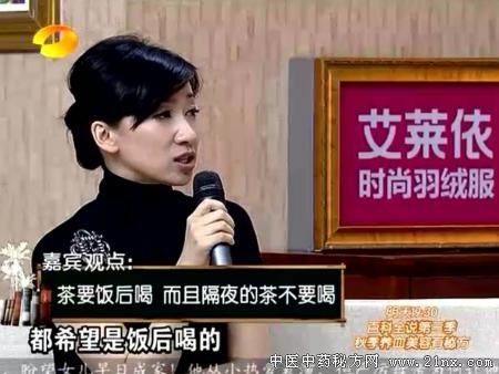 湖南卫视百科全说20111003 王琼介绍喝茶要看舌苔颜色? 茶是“万病之药”有益于身心健康,茶不宜多喝,每一种茶含的成分不一样,对养生的特性就不一样。绿茶含茶多酚最多,有抗氧化,抗衰老的效果。普洱、黑茶不含茶多酚,没有抗氧化、抗衰老的效果。春夏喝绿茶、秋冬喝红茶。 舌苔呈黄色是热性体质,喝绿茶、菊花茶比较好, 舌苔呈薄白色是寒性体质适合喝红茶(可以适量加姜、红糖),中性、温和体质适合喝绿茶。 舌苔黄腻便秘的症状,喝绿茶比较好。舌质发黑比较严重的应去医院检查。吃火锅、烧烤后可以喝绿茶抵消致癌物质。 茶都是要饭后喝的。隔夜茶也不能喝。适量的喝红茶、玫瑰花茶、菊花茶有益身心健康。 经常用电脑的人适量的喝菊花、枸杞、决明子、龙井茶可以平肝明目。睛干涩的人喝1-2天菊花、眼枸杞、决明子、龙井茶即可。 女性在经期的时候,也可以喝茶,只是注意不要喝浓茶。浓茶不是适合每一个人的,淡淡的清茶更适合养生。