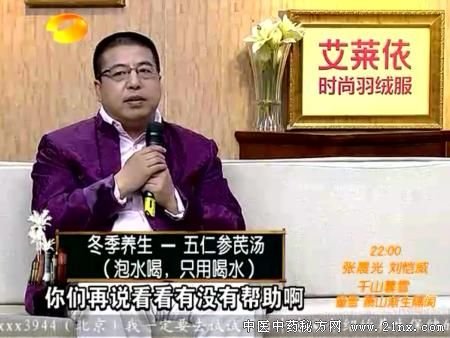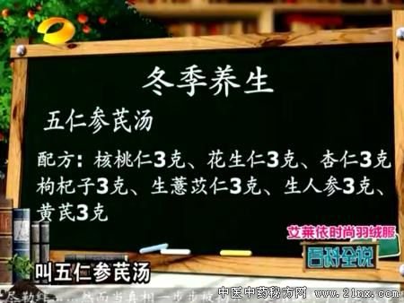 百科全说闫民川老师在节目中为我们介绍了一种冬季养生汤:五仁参芪汤让我们来具体说说这款养生汤吧 闫民川 五仁参芪汤的配方做法 配方:核桃仁,花生仁,杏仁,枸杞子,生薏苡仁,生人参,黄芪各3克。 泡水喝,只用喝水。整个冬天都可以泡水喝,只用喝水。就像泡茶一样。 注意事项:只可饮水不必吃其中东西!