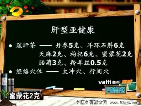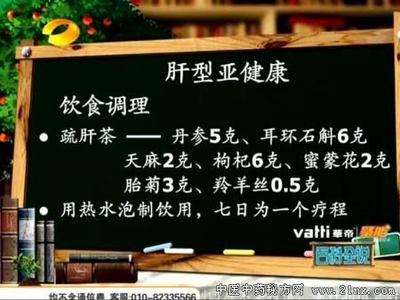 百科全说闫民川 肝型亚健康如何调理: 肝型亚健康主要表现为:急躁易怒,容易疲劳等。 我们可以从饮食,运动,和经络三方面进行调理。 肝型亚之饮食调理: 疏肝茶: 丹参,耳环石斛,天麻,枸杞,蜜蒙花,胎菊,羚羊丝。 用热水泡制饮用,七日为一个疗程。