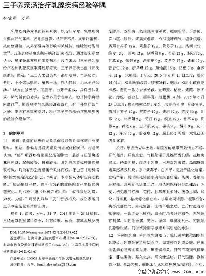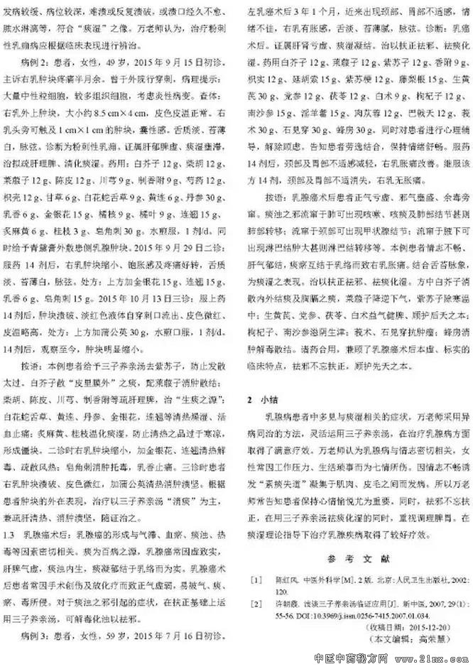 乳腺疾病为常见的外科疾病,以女性多发。乳腺疾病主要由肝气郁结,或胃热壅滞,或肝肾不足,或乳汁蓄积,或痰瘀凝结,或外邪侵袭等影响相关脏腑、经脉的功能所致。三子养亲汤出自《韩氏医通》,由紫苏子、莱菔子、白芥子组成,具有温肺化痰、降气消食的功效,临床多用于治疗老年肺系痰湿阻滞证。肺系痰湿与乳腺痰湿在治疗上有“异病同治”之妙。万华老师从事乳腺疾病诊治30余年,通过大量临床实践发现,痰湿是乳腺疾病发病的重要病机,采用三子养亲汤治疗切合病机。![]() ![]() |